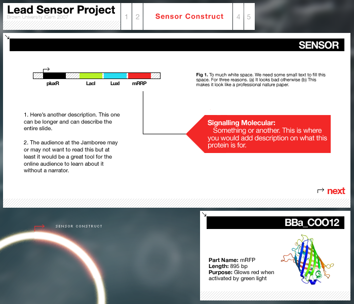 My mock-ups for our project presentations. It can be presented during the Jamboree and accessed as a tutorial from the website. John had a good idea about constantly reminding our audience where all of this takes place and I tried to incorporate it. Hope you guys like.