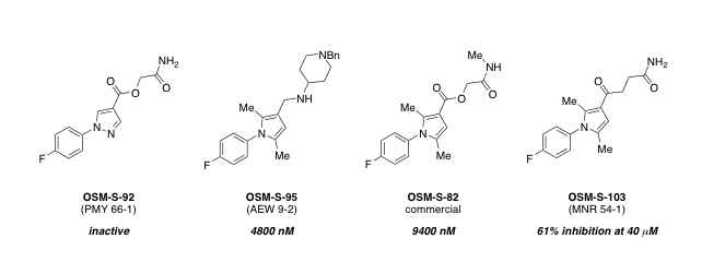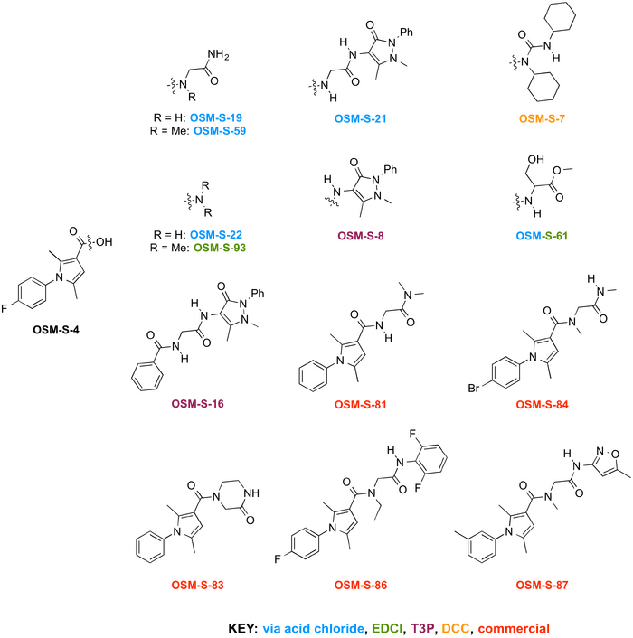 Several amide analogs were made or purchased. Attempts to synthesize OSM-S-19 directly through coupling of OSM-S-4 with glycinamide using T3P or DCC failed, but the compound could be obtained through SOCl2-mediated pre-formation of the acid chloride. This approach was also employed successfully for OSM-S-59, OSM-S-21, OSM-S-22 (though this compound was not adequately characterised and not biologically evaluated) and OSM-S-61. OSM-S-93 was obtained by a direct coupling of the acid OSM-S-4 with methyl amine using EDCl.HCl and HOBt, a procedure that was also successfully employed with OSM-S-61. OSM-S-16 was obtained through a T3P-mediated coupling between hippuric acid and 4-aminoantipyrene; this coupling strategy also successfully gave OSM-S-8. The urea compound OSM-S-7 arose as a byproduct from DCC-mediated attempts at OSM-S-8 and OSM-S-19. The amine OSM-S-18, used for the synthesis of OSM-S-21 was prepared (and used crude) by acidic deprotection of its Boc-protected precursor OSM-S-17, itself obtained from a T3P-mediated coupling of the commercially-available halves Boc-protected glycine and 4-aminoantipyrene. This route to the amine was found to be superior to an attempted saponification of OSM-S-16. Compounds OSM-S-81, OSM-S-83, OSM-S-84, OSM-S-86 and OSM-S-87 were purchased.