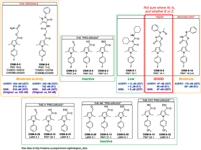- Late Stage Gametocyte Assay: Four of the compounds have also been evaluated in a late stage gametocyte assay with very interesting results indicating unusually high activity in blocking the transmission of the parasite. The original GSK compound OSM-S-5 was inactive. Discussion page here.
