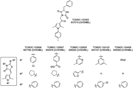 Though compounds with related substructures had been found to be false-positive pan-assay interference compounds (PAINS), it was thought unlikely that the present compounds suffered from this.