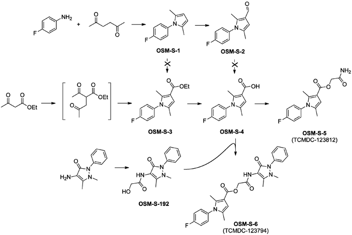 The two GSK hits TCMDC-123812 (OSM-S-5) and TCMDC-123794 (OSM-S-6) were synthesised via the novel pyrrole acid OSM-S-4 that was prepared using a Paal-Knorr cyclization of the relevant aniline and ethyl 2-acetyl-4-oxopentanoate (procedure adapting Lit 1 and Lit 2) to give the novel pyrrole ester OSM-S-3 which could be saponified to the acid. This approach was found to be superior to an alternative involving initial synthesis of the unfunctionalised pyrrole OSM-S-1, followed by conversion to the known aldehyde OSM-S-2 with a Vilsmeier-Haack reaction (a procedure that was improved through a community suggestion) and then oxidation to OSM-S-4, because the aldehyde was found to be remarkably resilient to a range of oxidants. (An alternative route to the ester OSM-S-3 using a Friedel-Crafts acylation between the unsubstituted pyrrole OSM-S-1 and ethyl chloroformate, suggested in an email from the community, gave only starting material in two attempts). Conversion of the acid to OSM-S-5 (TCMDC-123812), the first of the original GSK hits to be resynthesised, was achieved using a base and bromoacetamide; this was found to be superior to a number of attempted alternatives including coupling with glycolamide either via the pyrrole's acid chloride or directly through the use of coupling reagents (diisopropylcarbodiimide (DIC) or propylphosphonic anhydride (T3P)) (Summary of all approaches). The second GSK hit TCMDC-123794 (OSM-S-6) however was successfully synthesised from the acid OSM-S-4 via the coupling of the corresponding acid chloride with a functionalised antipyrene moiety (OSM-S-192), itself made from commercially available 4-aminoantipyrene and glycolic acid, using the acetonide of the latter (OSM-S-193).