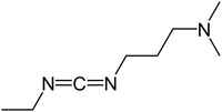 - Prepare aqueous solution of 20 mg/mL ethyl-3-(3-dimethylaminopropyl) carbodiimide(EDCI) and methoxyPEG-amine. The carbodiimide will activate the carboxyl groups of the citrate for amide formation. The methoxyPEG-amine is functionalized with an amine group at its end.