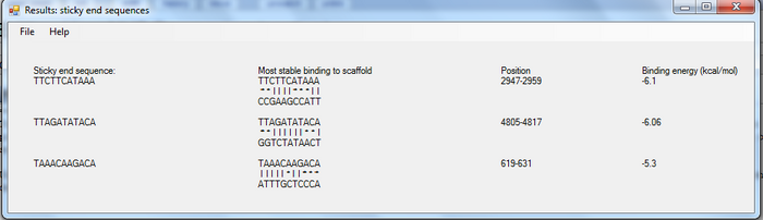 User can also ask the program to generate the sticky end sequence with the defined length. DNA sequences with binding energy higher than a limit defined are given. The below image illustrates the output of sticky ends' sequence generation.