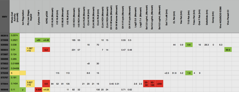A large range of data has been measured for the compounds and this is captured below in a condensed form of the master chemical list, which is colour coded to assist when glancing over the data (key: green = good, yellow = OK and red = poor).