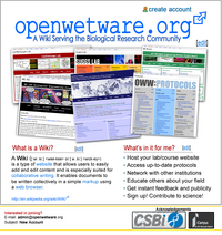 OpenWetWare (http://openwetware.org) is an effort to promote the sharing of information, know-how, and ideas among researchers and groups who are working in biology, biological engineering, and related disciplines. By providing a user-friendly editing interface (a wiki), the site provides a place for researchers to organize information and to collaborate with other community members. OpenWetWare currently hosts labs and groups from across the world including http://syntheticbiology.org.