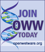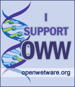 - Jennyn 12:18, 13 March 2006 (EST): I think the OWW works since it's defined at the bottom. I was following along with the format of the PLoS banner. I will make a horizontal one for lab websites. And we will definitely provide HTML code at the bottom of the currently "discussions" section, which will probably turn into "promote OWW".