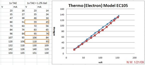 - The run time for 96v at 84mA for a 1000bp (see reference for typical prokaryote gene size I currently work with) band takes about 20 minutes to resolve, up to 40 minutes to get a good separation if you have multiple near-by bands.