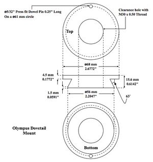 I still hate Olympus. Below I have a design for a dovetail adapter plate that has the ability to mount any type of optics to it you want. The thread is an M30 x 0.5 all the way through. I had to go with this one because it was able to thread completely through the dovetail mount. You can purchase thread adapters from Thorlabs. I couldn't use the standard C mount threads because it was too small in diameter and T mounts were too big.