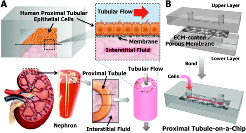 Kidney-on-a-chip effectively combines the leading motivations behind the developments of lung- and liver-on-a-chip, as the kidney faces both structural 3D microenvironments and issues with drug-induced renal toxicity and injury. Unfortunately, advancements in creating an effective and relevant kidney-on-a-chip are hindered by the cellular composition and 3D architecture of the kidney, as it presents a fairly significant translational barrier. There are more than ten renal cell types[18] arranged in an increasingly complex 3D structure, which is further compounded by a complex vasculature system. Even the main function of the organ presents as a complex issue, as there is filtration by the glomeruli and a two-way active secretion and reabsorption process in the tubular apparatus, all occurring in tandem. However, these uptake processes are central in understanding the mechanism of drug-induced renal toxicity and quantifying sensitivity to toxic agents.[19] Another issue that plagues kidneys-on-a-chip is the dependence on nonhuman cell lines such as the Madin-Darby canine kidney (MDCK) cell line as cellular basis for the chips, as immortal human cell lines struggle to express central transporter families and are transitioning away from epithelial cells to mesenchymal cells.[20] Freshly derived human renal cells show promise, but there are issues with donor variability and maintaining their specificity as time goes on. Nonetheless, chips have been developed using a multi-level flow through design. The basic structure of the proximal tubule is replicated by sandwiching a layer of human proximal tubular epithelial cells on an ECM-coated porous membrane, then exposing both sides of the membrane to constant flow.