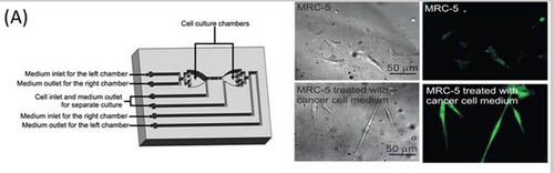 Fibroblasts are connective tissue cells found to be associated with all stages of cancer proliferation. Fibroblasts are recruited by tumor cells to produce specific growth factors. Microfluidics have been used to simulate these interactions in vitro. For example, Qin et al. fabricated a multichambered device for the co-culture of fibroblasts and tumor cells while allowing for diffusional interactions between parallel channels (Figure 7).[27]