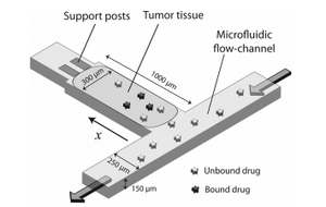 The kinds of chemotherapeutic dosing studies were performed using a device created by the Forbes lab at UMass Amherst. The dimensions of the device were 1000 mm x 300 mm x 150 mm, and a microfluidic channel, 250 mm wide and 150 mm tall. Experiments were conducted using human colon carcinoma spheroids. The device was designed to mimic the interface between a tumor and surrounding vasculature (Figure 12).[23]