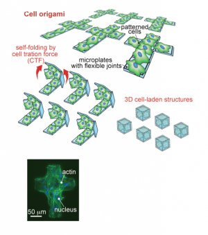 Scientists from the University of Tokyo, Japan designed an experiment that created a self folding cell-laden micro-structure. They named this new method, "Self-Folding Cell Origami". The premise was to use a force that cells exerted naturally, the cell traction force (CTF), in order to make a controlled three dimensional structure. In their experiments, the researchers coated glass plates with a gel that cells could not attach to. They then placed micro plates on the plate a short distance apart. Cells were then seeded on the micro plates. The cells then bridged the gap and pulled against each other, creating a 3-d structure.