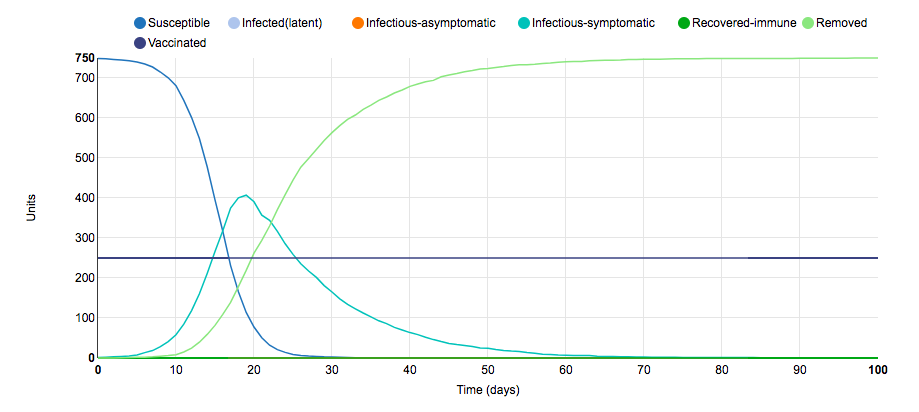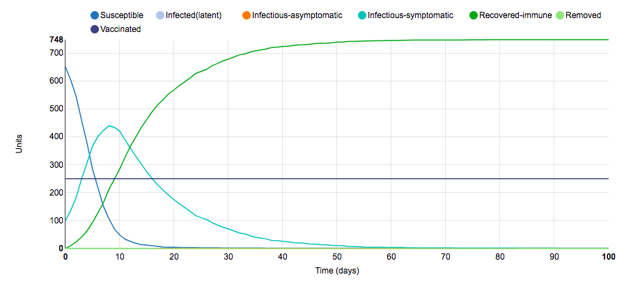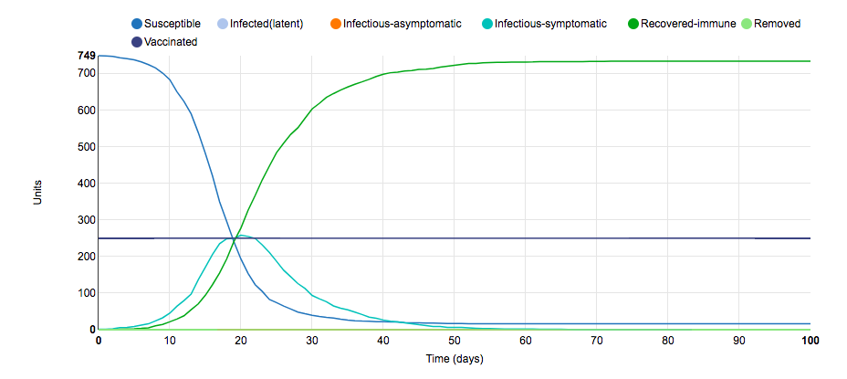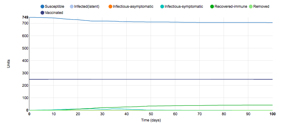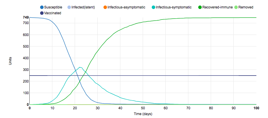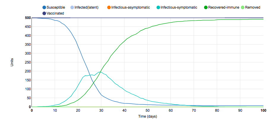 To obtain this graph of the S.I.R model, I changed the parameters surrounding the number of units vaccinated. In the initial graph, 5/10 of the populations were vaccinated and half of the units in the vaccinated populations received the vaccinations (250 total units were vaccinated); however, in this graph, 10/10 of the populations were vaccinated and half of the units in the vaccinated populations received the vaccinations (500 total units were vaccinated). It was hypothesized that the increase in the number of vaccinations would dramatically decrease the number of infections due to a conferred herd immunity. This hypothesis ended up being incorrect. Although the magnitude of the slope of susceptible units and infected-symptomatic units decreased and the curve was flattened, there was still ~200 infected units. Thus, the increase in vaccinations did not make as much of a change as expected. This small S.I.R. parameter change illustrates the need for a high percentage of the population to be vaccinated to confer herd immunity.