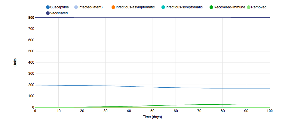 To obtain this graph of the S.I.R model, I changed the parameters surrounding the number of units vaccinated. In the initial graph, 5/10 of the populations were vaccinated and half of the units in the vaccinated populations received the vaccinations (250 total units were vaccinated); however, in this graph, 10/10 of the populations were vaccinated and 80% of the units in the vaccinated populations received the vaccinations (800 total units were vaccinated). It was hypothesized that the increase in the number of vaccinations would dramatically decrease the number of infections due to a conferred herd immunity. This hypothesis ended up being correct. Approximately 30 infections occurred over the 100-day period. Thus, the increase in vaccinations made a large difference. Because 80% of the total number of units started out with immunity, the infection rate was stifled. This small S.I.R. parameter change illustrates the need for a high percentage of the population to be vaccinated to stop diseases such as the flu and COVID-19.