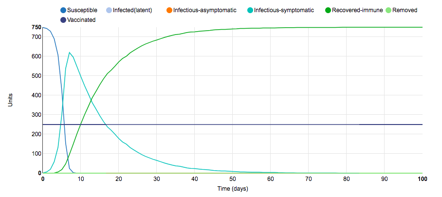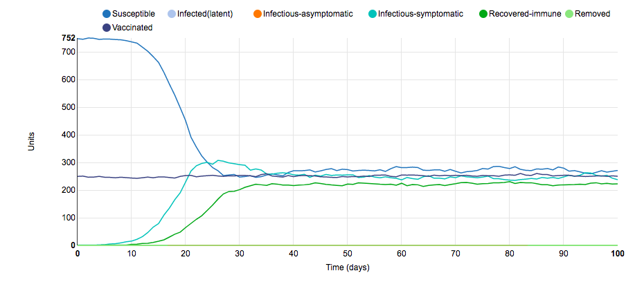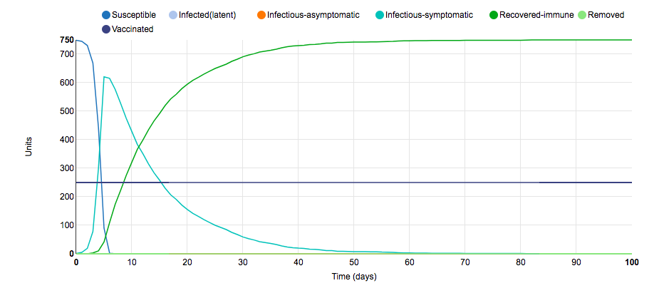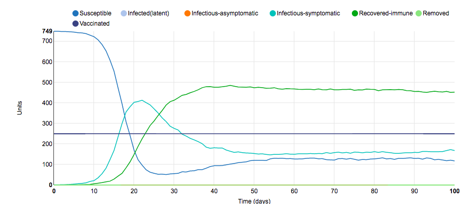 To obtain this graph of the S.I.R model, I changed the parameters surrounding the conferred immunity after recovery. In the initial graph, after an infected unit recovered from the disease, the unit remained immune from the disease for life; however, for this graph after an infected unit recovered from the disease, the unit only remained immune from the disease for 30 days. Due to the fact that after 40 days (10 days of infection and 30 days of immunity), previously recovered-immune units would become susceptible units again, the lines for susceptible, infected-symptomatic, and recovered-immune remained at a consistent number past day 50. Changing the duration of immunity to the disease had a similar effect to opening up the population because there was a steady stream of susceptible units entered the population while a steady stream of recovered-immune units left the population; thus, the disease was able to maintain a fairly constant rate of infection because the number of susceptible units never decreased. This S.I.R. parameter models a disease such as the flu because immunity to one strain of the flu does not confer immunity to a different strain of the flu. For this reason, receiving yearly flu vaccinations is crucial.