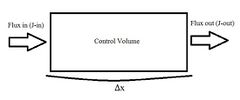 For a one dimensional system as described in Figure 1, with a species concentration, [math]\displaystyle{ C }[/math] following relations can be made to relate flux in, [math]\displaystyle{ J_{in} }[/math] , flux out, [math]\displaystyle{ J_{out} }[/math] and control volume [math]\displaystyle{ V }[/math]. From this system, the Péclet number can be derived.