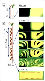 In units where quick mixing is not desired (for example, analytical tests or separation systems), low Pe (of less than or around 1) is ideal. T-sensors, as shown in Figure 2, are an example of a class of analytical devices that benefit from low Pe. T-sensors are used in many competitive immunoassays, where antigen and antibody are input into the T-sensor. Given the known diffusion patterns that are expected, as shown in Figure 2, any deviation from this pattern indicate antibody binding. T-sensors can also be used in simpler cases, such as to quantify the diffusivities of the analyte and reaction kinetics since the effects of turbulence are neutered [4]. Separation is also possible without the use of membranes in microfluidics, due to low Pe, as evidenced by the H filter. H-filter takes advantage of the fact that larger species have lower diffusion constants than smaller species. Proteins, for example, have diffusion coefficient three orders of magnitude larger than that of salt ions. [3] Separation can be achieved in a 'H' shaped channel, where a mixture will enter on the ends of the 'H' and a separation will occur such that the larger species will exit the bottom of the same side, while the lighter species will traverse the middle section of the H onto the other side.