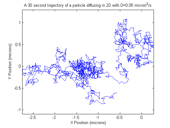 title('A 30 second trajectory of a particle diffusing in 2D with D=0.05 micron^2/s')
