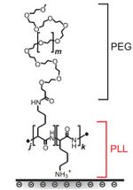Many surfaces modifications are done by adding what's known as a polymer brush. These brushes consist of a graft copolymer, meaning a copolymer with a backbone of polymer A and sidechains of polymer B. Typically, the brush is made of a poly(L-lysine) (PLL) backbone and poly(ethylene glycol) (PEG) side chains. PLL is cationic, so it may bind to surfaces such as negative silica, whereas PEG is neutral, hydrophilic, and capable of hydrogen bonding. This gives the brush protein-repellent properties[15]. The chemical structure of a PLL-PEG brush is found in Figure 5.