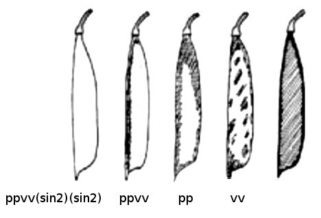| Pod-wall fiber gene #2 (v) | rec | 4 | P V normal parchmented pod; p V strip of sclerenchyma; P v inner membrane reduced to patches of sclerenchyma; p v entirely without parchment. | |