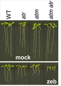 ![]() Cytidine analogs, zebularine or 5-aza-cytidine, are used in epigenetic research as suppressors of gene silencing. However, their molecular effects are only incompletely understood. We found that zebularine treatment triggers DNA damage response that is signaled additively by ATR and ATM kinases and is repaired preferentially by synthesis-dependent strand annealing-type of homologous recombination. Our current efforts are focused on understanding the mechanism of zebularine DNA damage induction and repair in plants.