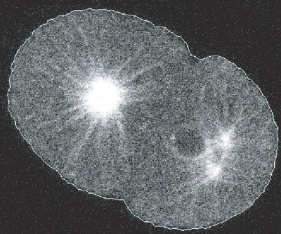 Based on phase contrast images of giant unilamellar vesicles (GUV) acquired at high speed imaging (30 frames per seconds) using non-standard camera, I took advantage of characteristic halo visible around objects in phase contrast microscopy (Inoué and Spring, 1997) to detect on the fly, with 80 nm accuracy, the contour of the vesicle, without any model assumption ( Pécréaux, 2004 ; Pécréaux et al., 2004). Indeed, at that time, it was not technically possible to store massive series of images and the image processing must be done in real time with the acquisition.