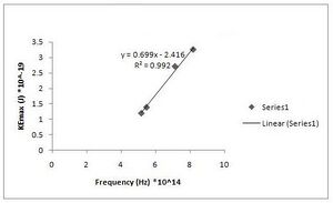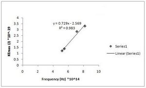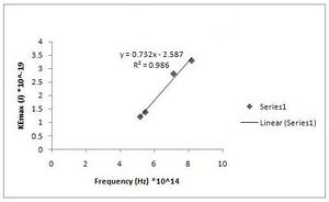 After measuring the stopping voltage of a number of electrons, we were able to find the kinetic energy with the equation from methods and material (KEmax = qVstopping). Using the kinetic energy and the frequency of light found in the lab manual (see Fig. MM- 5), we were able to graph it and find a slope, h. The diffraction grating by the light source refracted two sets of maxima. The first, brighter maxima was the subject of two of our data sets, while the second, dimmer maxima was the subject of two more of our data sets. (see Fig. MM - 3). (Raw data for graphs of Experiment 2 can be found here) As you can see in Fig. R-6 to R-9, we recorded a stopping voltage for the colors yellow, green, violet, and UV (found in raw data above), and after we found the KEmax, we plotted them on an graph with one axis KE, kinetic energy, and one axis frequency. We used excel to form a least-square fit line and to find the slope of that line. It gave us the slope of the line and the y-intercept which is the work function mentioned in methods and materials above. (see Fig. MM - 3)