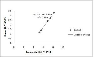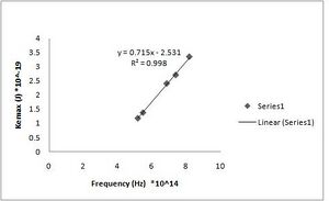 h = 7.17(+/- 0.010)*10^-34 J s [math]\displaystyle{ W_0 }[/math] = 2.58(+/- 0.041)*10^-19 J