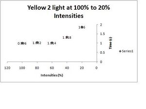 After Linh and I recorded the rise time of each color in the spectrum shown along with each intensity on the filter (100%, 80%, 60%, 40%, 20%), we used excel to plot intensity vs. time (in seconds) to determine if in fact light is directly related to its intensity or if light only depends on frequency.