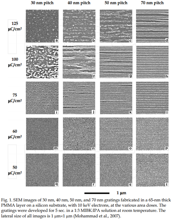 The exposure process involves several variables such as exposure time and intensity. Figure 2 [8] shows an example of differently sized gratings made using electron beam lithography, and the effect of beam intensity has on effectively creating specific grating spacing.