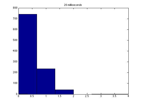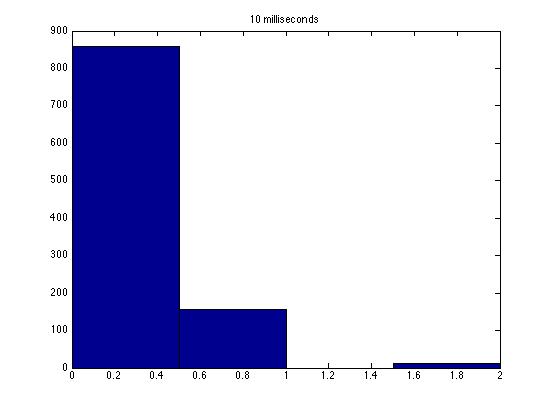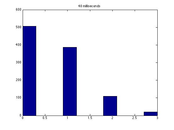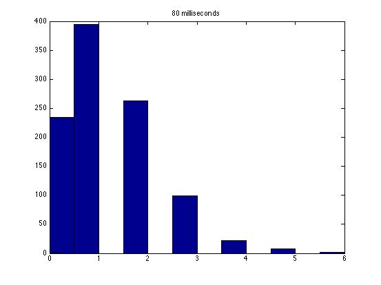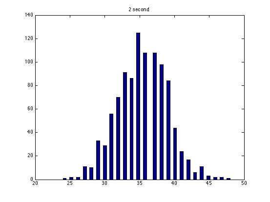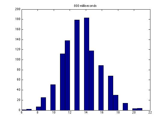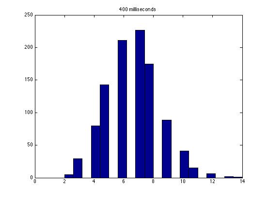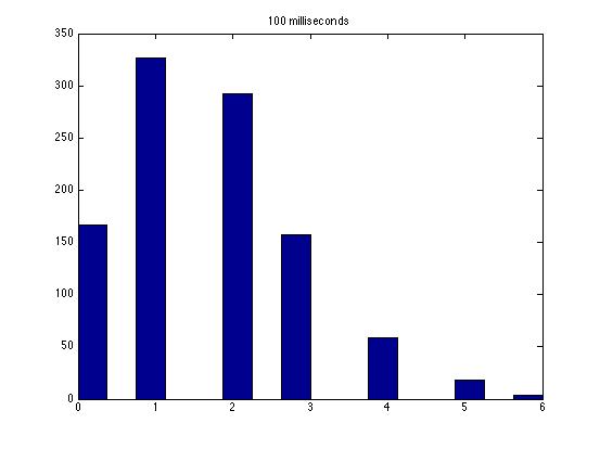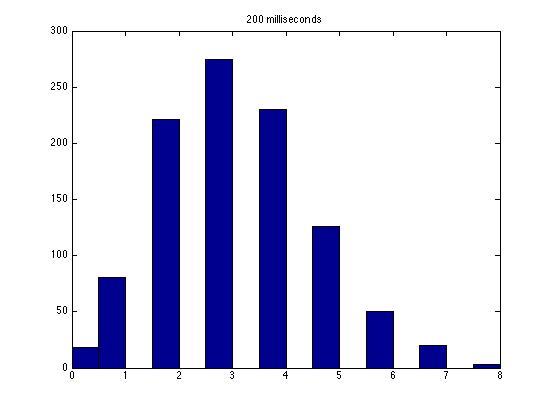 These graphs are a good start, but some things are missing. First, it would be a lot better if you could figure out how to get matlab to not put gaps of differing sizes between the bars--that makes it tough to look at the shapes of the distributions. Second, you should overlay best fit Poisson and Guassian distributions on the graph for comparison.