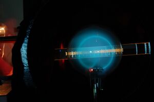 1. We see the electron beam due to the bremsstrahlung effect, which exists due to the helium in the glass tube.SJK 02:00, 3 November 2008 (EST)