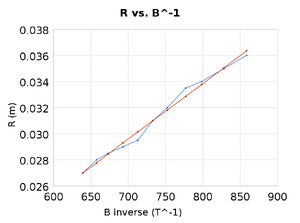 [math]\displaystyle{ \frac{e}{m}= (2.17\pm .02) \times 10^{11} \frac{C}{Kg} }[/math], which is a relative error of 23.6% and a fractional error of 0.9%. Forming a least squares fit of the data for the constant current, varying voltage or for varying current and constant voltage gives similar results, which leads to the conclusion that the majority of the error in the measurement of e/m must be systematic error.