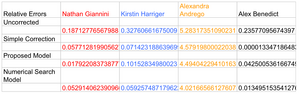 The next reasonable step to take would be to perform a numerical search on a larger set of data to find the coefficients which minimize the error in the model. To do this I created a super set of data, from the lab notebooks of Nathan Giannini, Kirstin Harriger, Alexandra Andrego, Alex Benedict. I would like to thank them for making their data easily available online, I assembled the assorted data here: [1]. I Performed a simple search through a restricted set of the possible coefficients (Code Here :User:Alex_G._Benedict/Notebook/Physics_307L:_Junior_Lab/SimpleSearchScript) instead of using least squares fitting since the inclusion of Andrea's data led to ridiculous values and I wanted to search only through a restricted set of information anyway. The result of this simple search was [math]\displaystyle{ \frac{e}{m}=\frac{2(0.8V_{acc}-10r)}{B^2r^2} }[/math] when the radius is measured in meters. This just further reinforces the ideas presented above, since there is a model which performs better than the simple model for all data, as can be seen in the last column of the data superset.