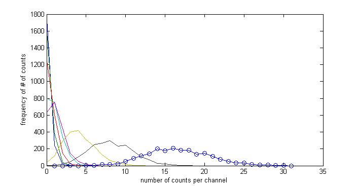 - For this lab we collected data measuring the incidences of radioactive events at different dwell times. The dwell times were at 10,20,40,80,100,200,400, and 800 ms. Using the data from each different dwell time, we found the average values for each set and the standard deviations. We then graphed the frequency of the number of counts per channel vs. the number of counts per channel. Ginny used MATLAB and Excel to plot the graphs.