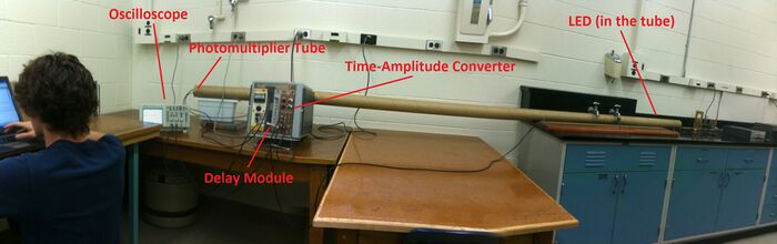 We positioned a photomultiplier tube (PMT) powered by a Bertran 313B Power Supply on one end of a carboard tube. We placed a LED in the other end, powered by a Harrison Laboratories 6207A PSU. We measured the time difference between the LED's pulse and the photomultiplier's response with a Ortec 567 TAC/SCA Module plugged into a Harshaw NQ-75 NIM Bin. We placed a Canberra 2058 Delay Module between the PMT and the TAC to guarantee the response pulse would be received by the TAC after the triggering pulse from the LED. SJK 11:56, 30 November 2009 (EST)