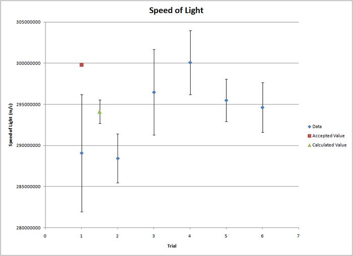 The calculated speed of light was 4 sigma away. Assuming only normally distributed random error, the probability of measuring the same value we did is 0.006%.SJK 13:35, 2 December 2009 (EST)