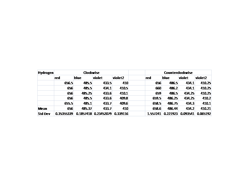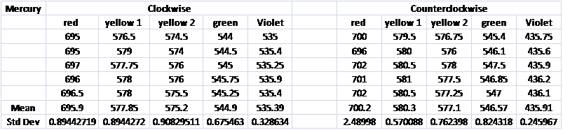Spectrometer (Last years manual has a diagram), a spectrum tube power supply SP200 at 5000 volts, and three various spectrum tubes of Hydrogen Deuterium, and Mercury. We set up the power supply with the correct spectrum tube in front of the spectrometer and turned it on looking through the eyepiece to see the spectrum lines incident from the light. During our initial set up of the experiment we discovered that different results were obtained by approaching the spectral lines from the right then from the left. We decided to fix this problem by taking measurements both from the left and from the right.