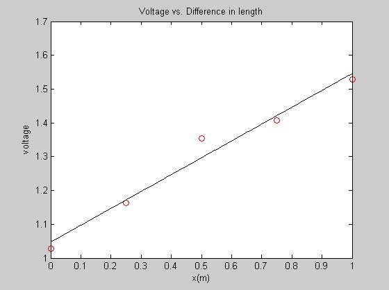xlabel('x(m)'),ylabel('voltage'),title('Voltage vs. Difference in length');