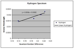 We will do so by plotting [math]\displaystyle{ \frac{1}{\lambda} }[/math] VS. [math]\displaystyle{ \frac{1}{2^{2}}-\frac{1}{n^{2}} }[/math]