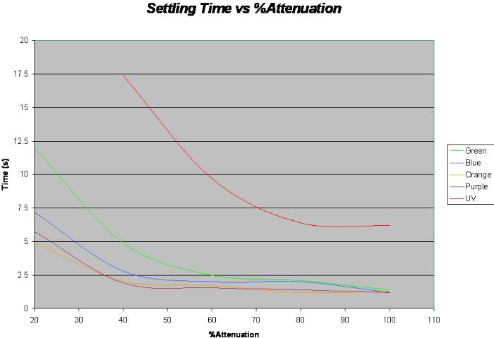 | % Attenuation | Orange | Green | Blue | Purple | UV |