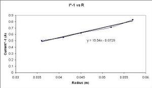 The next calculation uses google doc's spreadsheet (linest) program to calculate a linear relationship between the inverse current and the beam radius.