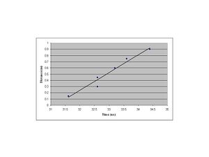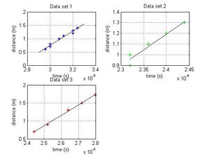 Once we completed calculating our times for each of the trials, we then proceeded to construct 3 least squares plots to determine what our value of the speed of light would be. To do this we simply took the distance recorded vs time which then gave us a very linear graph... the slope of this line is the constant we were looking for.