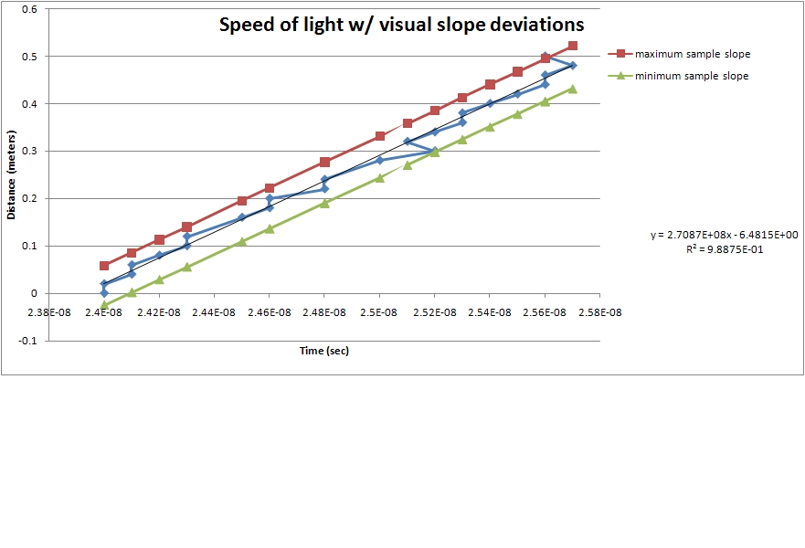 The initial voltages are different because of a small voltage offset to make it easier to read. The O-scope has limited digital resolution that manifests as steps in the available numerical values. I represented these in the errors that I put on each entry. With Dr. Koch's help I set the O-scope so the TAC reading was mostly of the screen and used the measure function to determine its value. This improved the resolution of the reading by a factor of two, changing it from .04 to .02. This allowed me to measure much more accurately and also have more valid data points along the same range of values (~60 cm).