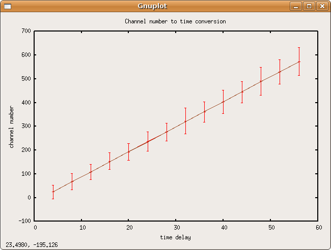[math]\displaystyle{  time \, delay=(0.09495 \pm 0.00626 \tfrac{s}{channel})(channel\,number) -(1.641 \pm 1.861)s }[/math]