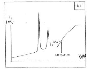From a collision standpoint, free electrons colliding with orbiting electrons need to have at least the minimum energy required to excite the bound electrons to higher quantum levels. This experiment involves collecting these electrons after their atomic collisions, and determining the separate excitation energy levels that are available. The theory is quite simple. If an electron collides with a bound electron, and has suffcient energy to “move” the bound electron up into new orbits (or even ionize the atom), then the energy absorbed by the atom is lost to the free electron. This is an inelastic collision, and the free electron will slow down appreciably. In particular, it can now easily be captured by an anode positioned near the beam. As a function of the electron accelerating potential, [math]\displaystyle{ V_A }[/math], the number of electrons captured will increase rapidly near the energy levels of the atomic gas in the tube. These peaks in current will signal the energy levels of the atom."(from Physics 307 Lab Manual)