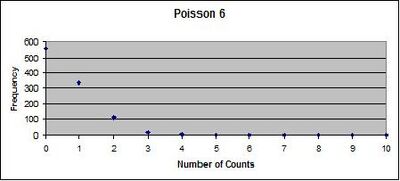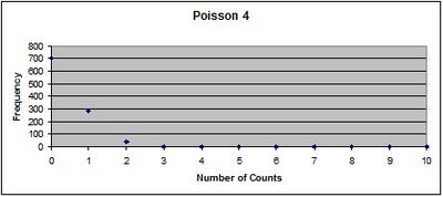 For Poisson Graph 4 Number Frequency Poisson Prob. 0 701 70.02% 1 282 24.96% 2 40 4.45% 3 1 0.53% 4 0 0.05% 5 0 0.00% 6 0 0.00% 7 0 0.00% 8 0 0.00% 9 0 0.00% 10 0 0.00%