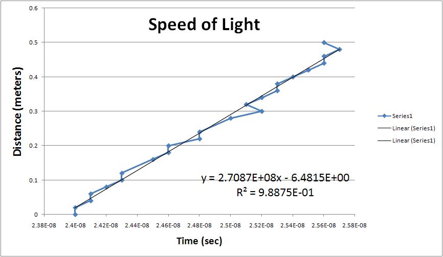 The initial voltages are different because of a small voltage offset to make it easier to read. The O-scope has limited digital resolution that manifests as steps in the available numerical values. I represented these in the errors that I put on each entry. With Dr. Koch's help I set the O-scope so the TAC reading was mostly of the screen and used the measure function to determine its value. This improved the resolution of the reading by a factor of two, changing it from .04 to .02. This allowed me to measure much more accurately and also have more valid data points along the same range of values (~60 cm).
