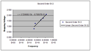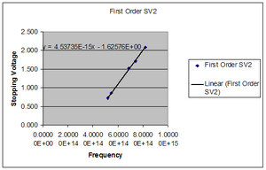 In this portion of the experiment we measure the stopping voltage associated with a given wavelength of light. This relationship should give us what we need to determine the value of h.
