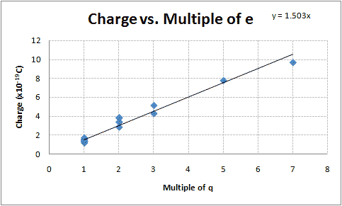When I sat down to write this lab up, I was at a loss as to how to analyze this data. After reading the notebook of my lab partner, Kyle Martin (i.e., all of the credit for this idea should go to him! It was his idea! See his graph!), I tried graphing the calculated charges vs. their suspected integer multiple of e-. There appears to be a linear relationship (See Figure 1). Using Excel to determine the slope of the line that fits this data (using the least squares method) and its uncertainty produces my best estimate of the value of the elementary charge: